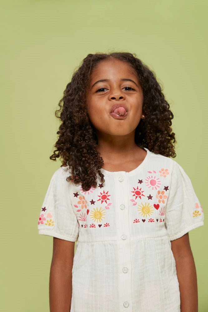Aus bequemem Musselin Baumwollstoff - vorne komplett durchgeknöpft - bedruckt mit vielen unterschiedlichen bunten Sonnen!