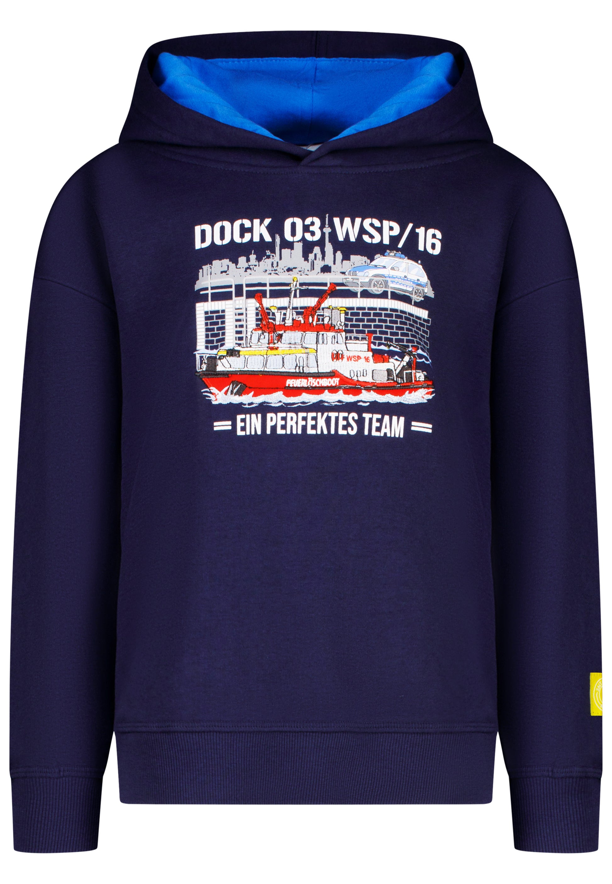 Mit großem Feuer-Löschboot als Stickmotiv - im Hintergrund mit Hafendruck und Polizeiauto als Print.