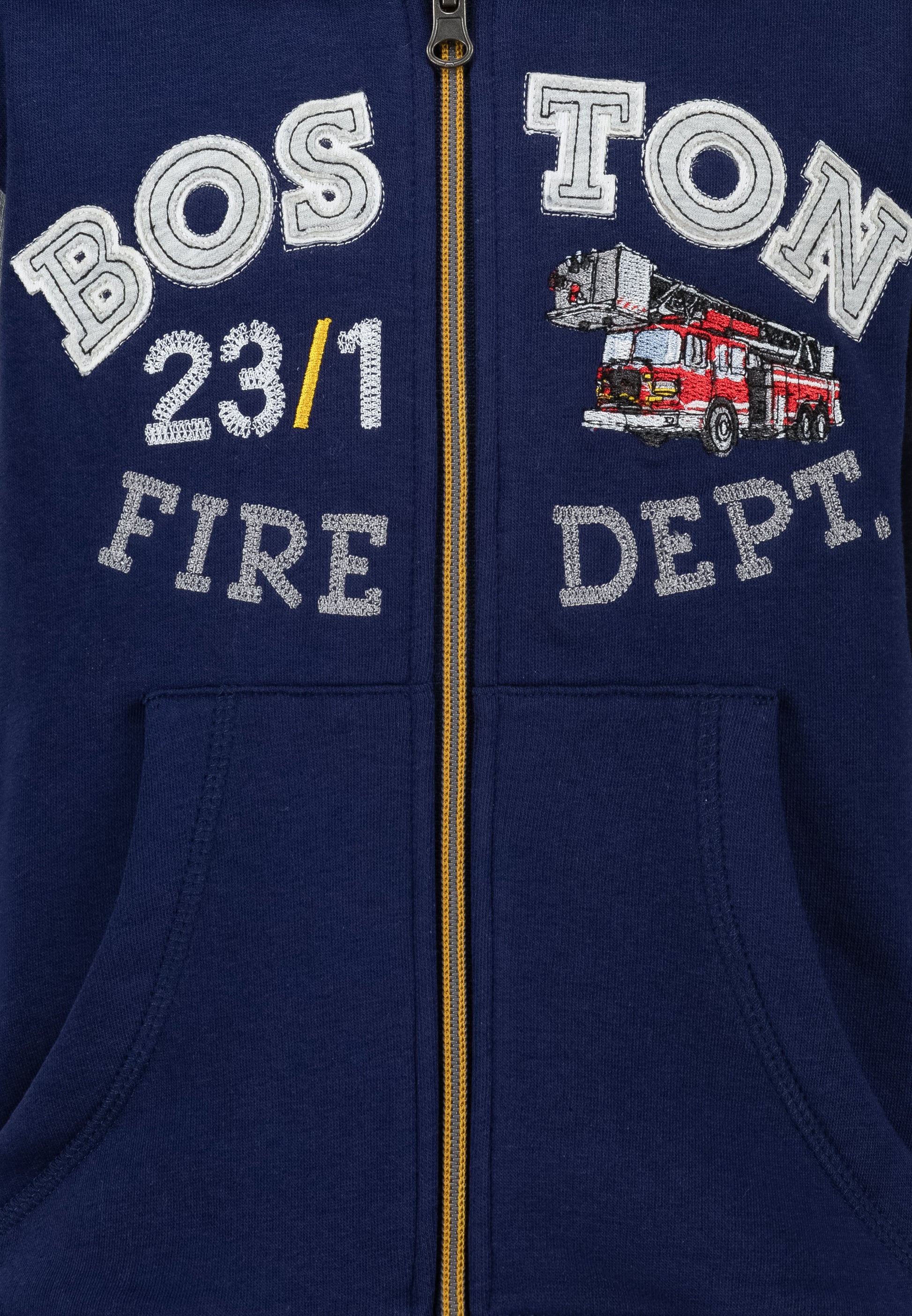 Mit eingesticktem Feuerwehrfahrzeug und Schriftzug sowie Buchstabenpatch.