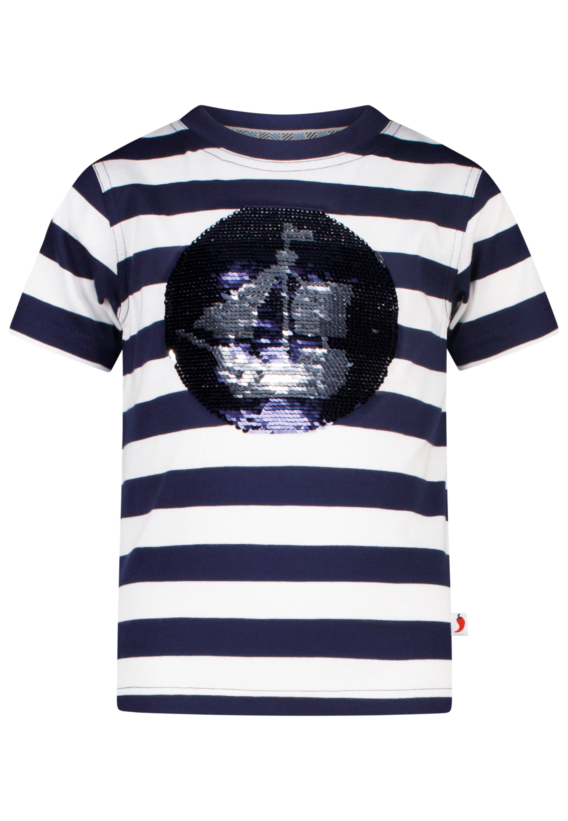 Mit maritimen Blockstreifen und einem Schiffmotiv aus wendbaren Pailletten!